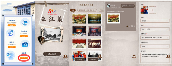 3.点击【进入活动】可查看校友上传的老照片-点击【我要上传】可上传老照片-点击【分享】邀请好友一起参与活动。