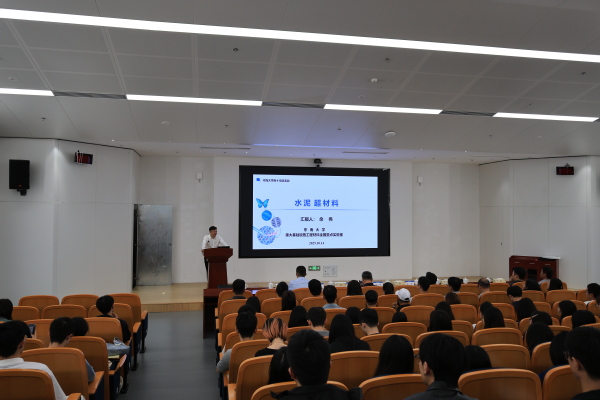 报告中,佘伟以“结构为骨、功能为肉、智能为魂”为引,分析了科技革命演化与材料学科发展的关系,系统阐述了对工程材料发展范式变革的深刻思考。他重点介绍了团队面向国家重大工程需求首创的“水泥基仿生超材料”新范式,团队通过仿生学与跨尺度设计,旨在突破传统材料性能极限,实现力学性能的跨越式提升,并赋予材料超绝热、超疏水、自修复等新功能。报告内容深邃,引人入胜,为现场师生清晰地勾勒出土木工程材料迈向智能化、绿色化与多功能化的前沿图景。