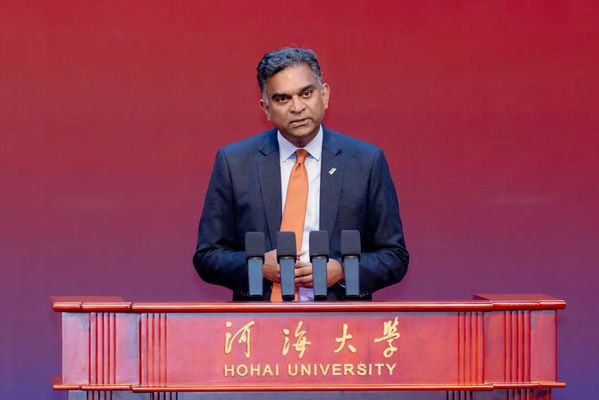 国际水协会总裁、执行主席Kalanithy Vairavamoorthy作为国际组织代表致辞。他表示,百十年来,河海大学不负其名,始终是知识溪流汇聚成智慧海洋的殿堂、求知探索与服务人类无缝衔接的家园,屹立于水科学与水利工程教育科研的前沿阵地,凭借卓越的学术追求与深植社会的责任感,成为享誉全球的水利领域权威机构与影响力广泛的学术中心。展望未来,期待与河海大学深化合作,共同推动知识进步、培育创新成果、培养新一代水利领军人才,祝愿河海未来百年能如过去般启迪人心、影响深远、改变世界。