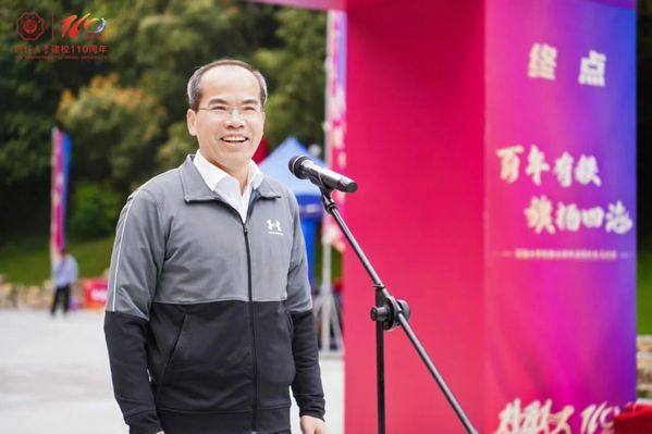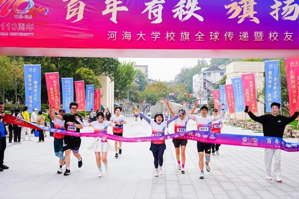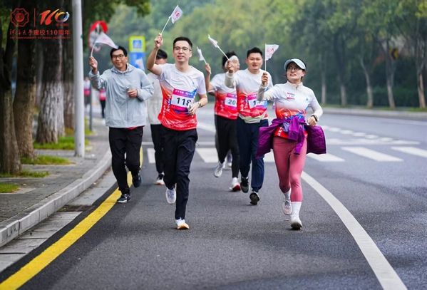 校长郑金海在终点与鲁宏振交接校旗,他向完赛的校友、师生表示祝贺,希望大家通过本次活动传递河海精神,在体育锻炼中磨炼意志,并与参赛选手合影留念。