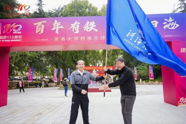 10月26日,迎着深秋第一缕晨光,河海大学庆祝建校110周年校旗全球传递暨校友马拉松活动在江宁校区鸣枪开跑。扬州校友会会长成立将校旗交给南京校友会执行会长鲁宏振。