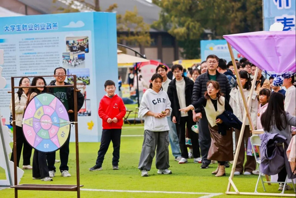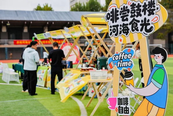 市集不仅是重逢的舞台,更是欢聚的盛宴。“青春乐燃·后浪造梦”舞台上,河海校园乐队用歌声点燃激情,全场齐唱校歌的震撼场面将活动推向高潮;“趣玩工坊·创动青春”设置互动游戏,释放青春活力;“职海启航·英才港湾”为学子提供政策解读、职业规划与形象打造一站式服务。鼓楼区以“人才咖啡”为载体,传递招才引智的诚意,推动人才与区域共成长。