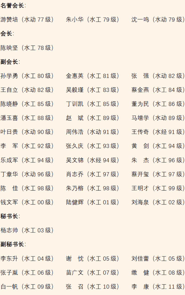 经水利水电学院推荐,水电校友会广泛征求意见,河海大学校友会审核,产生水电校友会第一届理事会成员。名单如下: