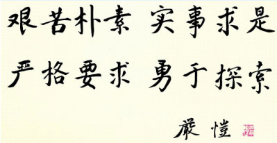 校训内涵:“艰苦朴素”是学校在创业和奋斗历程中的精神写照,也是对全校师生员工提出的生活准则,只有能吃苦的人才能在水利水电事业上有所作为。“实事求是”是我们党的光荣传统,也是在全校科研工作者中倡导的科研态度,知之为知之,不知为不知。“严格要求”是对全校师生员工提出的工作标准,就是对待学习和工作要有一丝不苟的严谨态度。“勇于探索”是在全校师生员工中倡导的精神风貌,只有不断探索,克难奋进,才能大胆创新,取得卓越成就。
