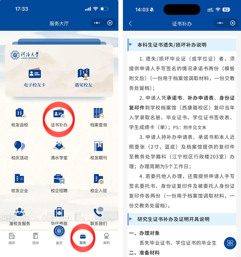 在微信搜索小程序“河海校友”,或扫描下方小程序码进入“河海校友”小程序。认证校友点击小程序服务大厅的【证书补办】即可查看毕业/学位证书补办事务,提供最优快速办理流程。